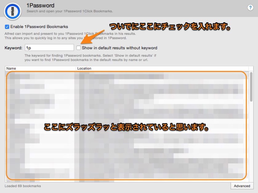 Alfredの設定に戻ってみると、さっきunable to find 1Password Dataとなっているところが消えて、設定してあるパスワードの一覧が出るようになっていると思います。